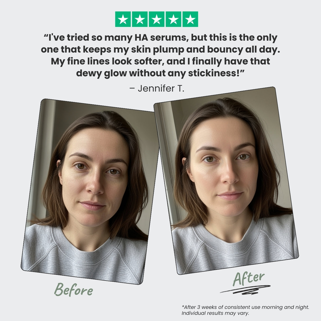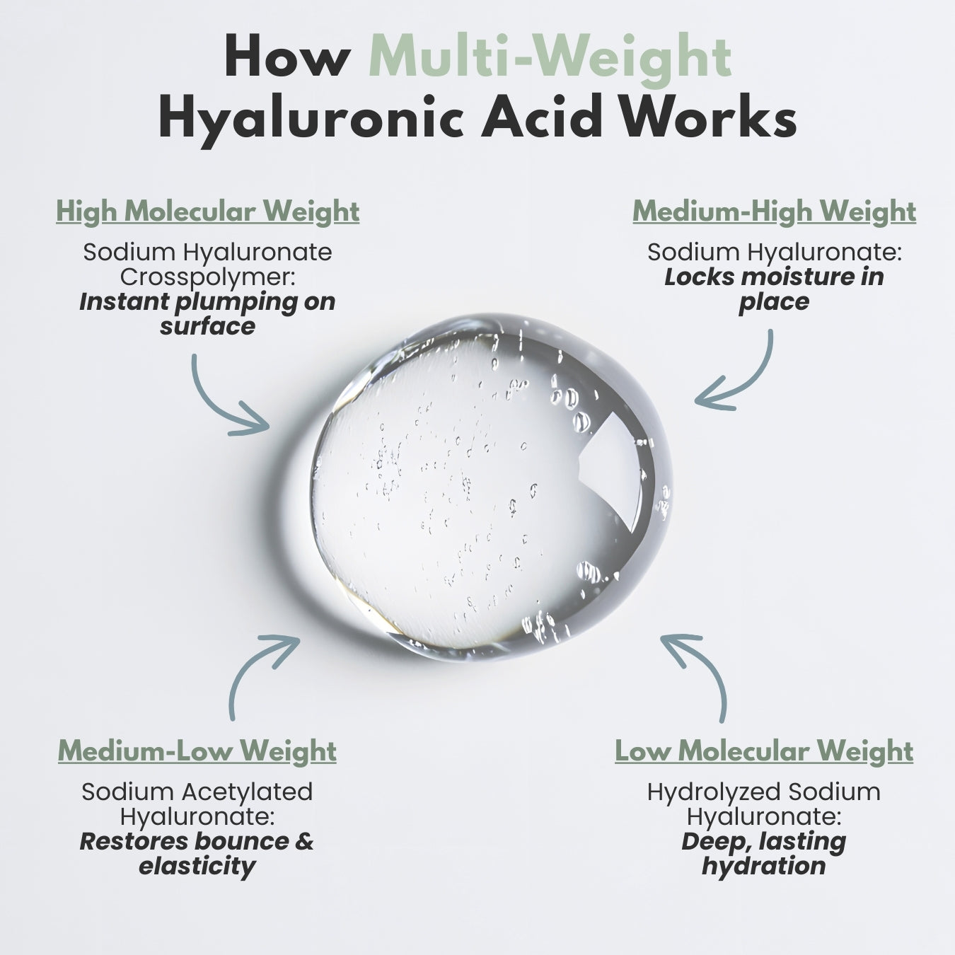 Our advanced multi-phase serum delivers four molecular weights of Hyaluronic Acid to hydrate skin at every level—from surface to dermis. Sodium Hyaluronate Crosspolymer and Sodium Hyaluronate cushion and plump the outer layers, visibly softening fine lines. Sodium Acetylated Hyaluronate penetrates deeper to support elasticity, while Hydrolyzed Sodium Hyaluronate—the smallest molecule—locks moisture into the deepest layers for lasting bounce and suppleness.